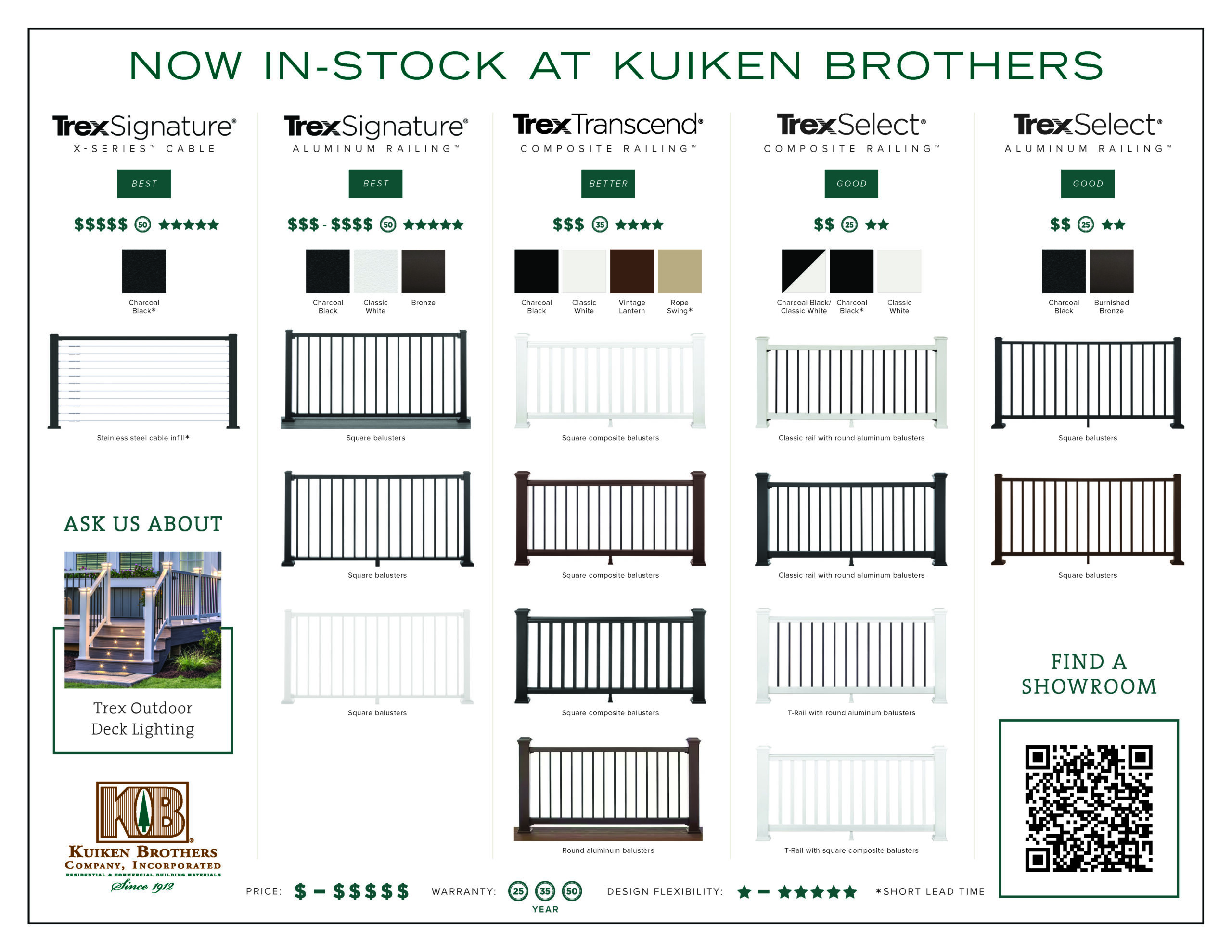 Kuiken Brothers offers a full selection of Trex railing systems to complete your outdoor living project, including Transcend Railing in White, Black, and Vintage Lantern, as well as the popular Trex Signature Black Aluminum Railing. Our inventory also includes Trex Signature railing in White and Select T-Rail, giving builders and homeowners flexible design options to match any decking style.