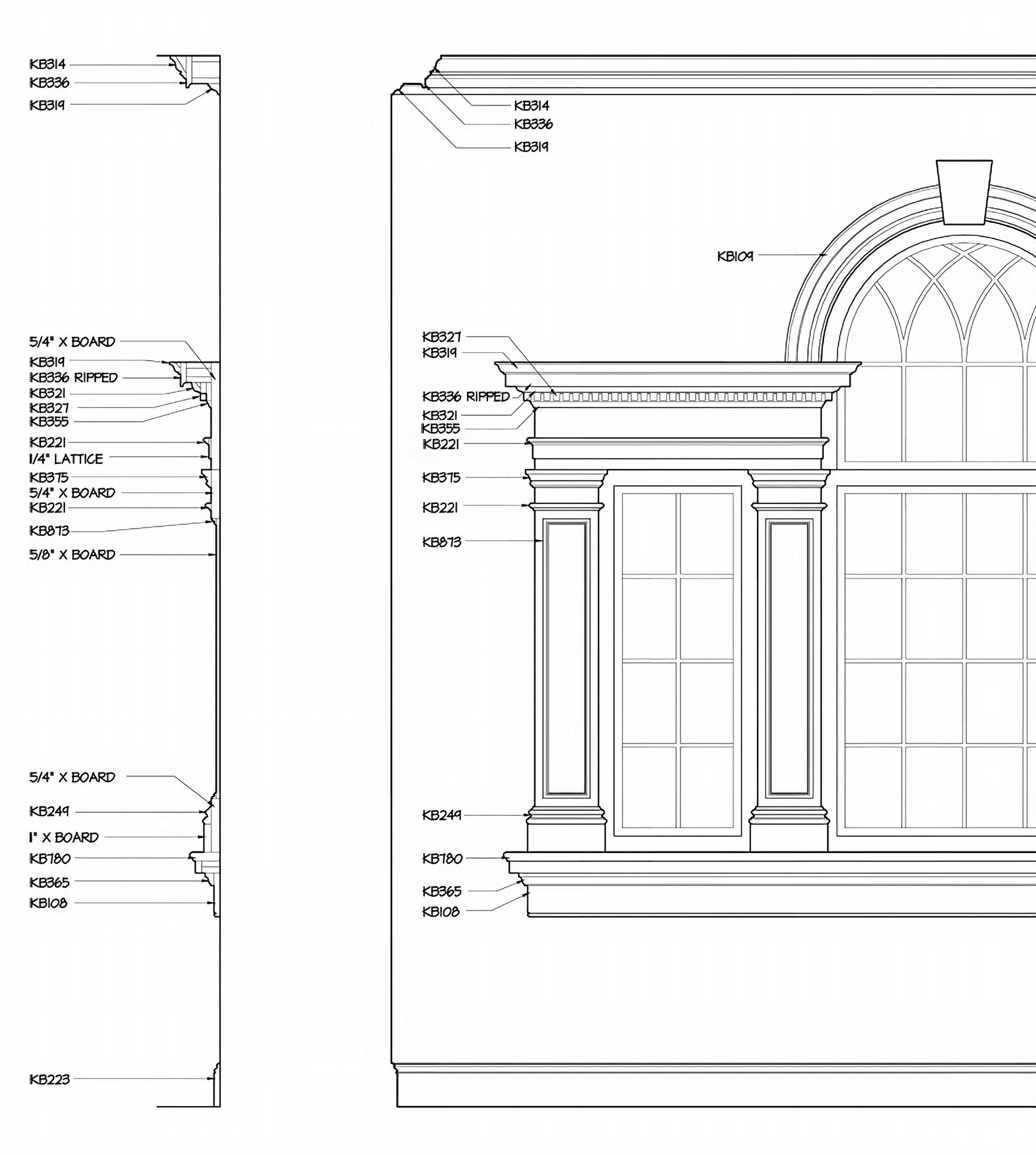 Find individual profiles used in this collection: KB873 Panel, KB780 Flat Bottom Stool, KB375 Beaded Solid Crown, KB355 Solid Crown/ Neck Moulding, KB336 Cornice Fascia, KB327 Dentil Moulding, KB321 Bed Mould, KB319 Bed Mould, KB249 Panel, KB221 Panel, KB109 Casing, KB108 Base