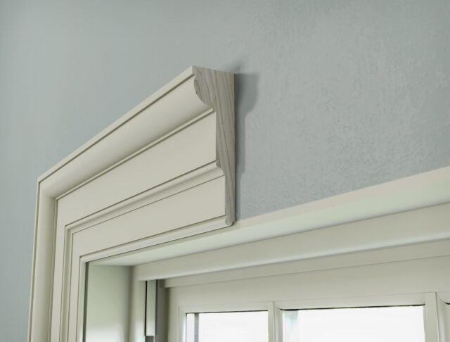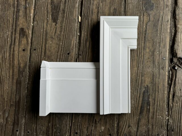 This profile is a little mix of the KB103 (1-1/2″ x 5-1/2″) casing and our KB112 (1-11/16″ x 5-1/2″) casing. Rather than add in the filler piece, the installer chose to leave the casing intact but fill the gap with a small floral rosette.