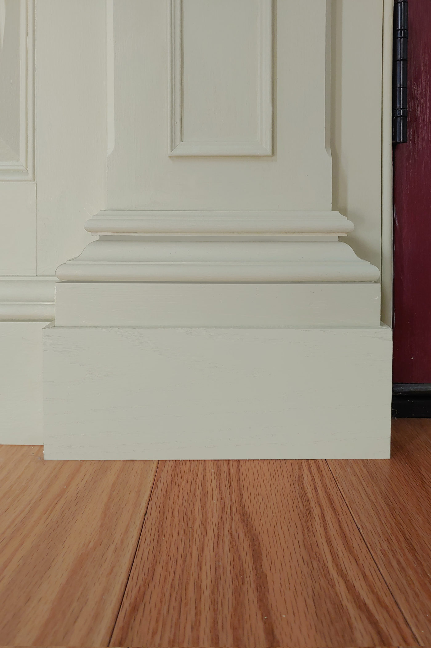 This chair rail caught our attention as it self returned to the wall. Chair rails will typically terminate into the backband of a thicker casing. In this situation the chair rail was applied to a panel wall and no casing was used in the opening. The self return allows the true design of the profile to shine in all of its glory.