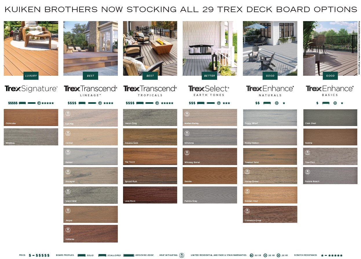 Thank you for your interest in Trex Decking & Railing from Kuiken Brothers Residential & Commercial Building Materials. With 9 locations in New Jersey & New York, we welcome the opportunity to support your project anywhere within the region. We are a Trex exclusive partner, meaning Trex Decking & Railing is the exclusive composite deck and rail in-stock brand. Trex is our primary decking & railing partner of choice. We have the inventory, the showrooms, the experienced and knowledgeable sales team to handle any size deck and railing project. Most of our building material specialists have trained directly with the Trex manufacturing team at their facility in Winchester, VA as we make an annual pilgrimage to their factory to learn about what is new and how best to support the Trex brand and customers here in our local NJ & NY markets.